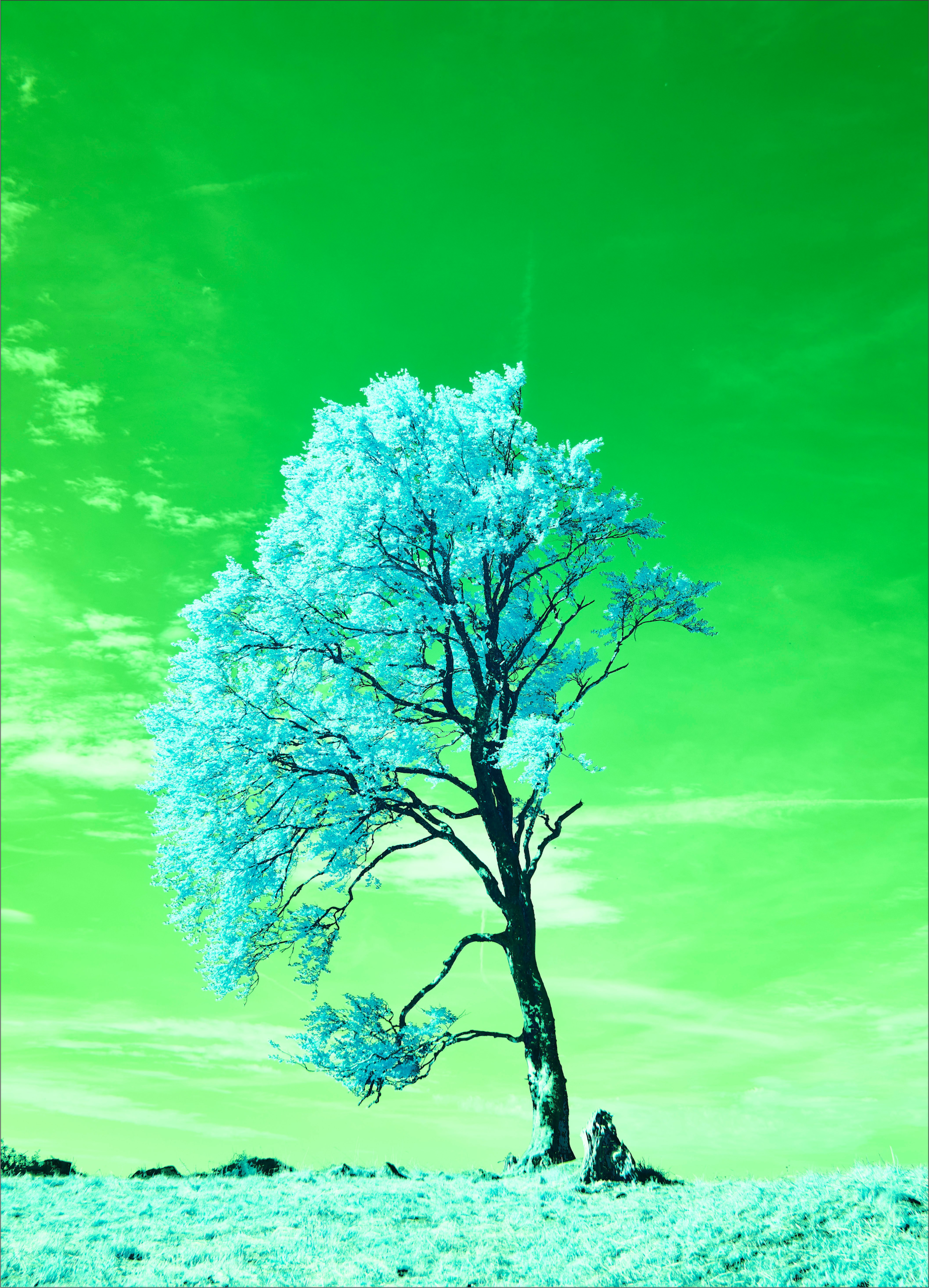 A lone tree with blue leaves under a green sky